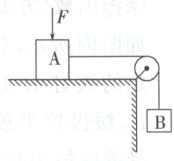 例① 如图所示,A物体重力为$20\mathrm{ N}$,B物体重力为$10\mathrm{ N}$,力$F$竖直向下,A与水平面的动摩擦因数$\mu=0.4$,其余摩擦不计(假设最大静摩擦力等于滑动摩擦力)。