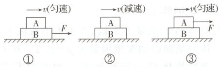 1.D 图①中,A、B一起匀速运动,A受到重力和支持力处于平衡状态,若受到B对A的摩擦力则A不能平衡,所以图①中A、B间不存在摩擦力;图②中,A、B一起减速运动,竖直方向上A受到重力和支持力,水平方向上,A做减速运动,则存在B对A向左的摩擦力,所以图②中A、B间存在摩擦力;图③中,A、B一起做匀速运动,A受到重力和支持力、拉力F以及B对A向左的摩擦力处于平衡状态,做匀速直线运动,所以图③中A、B间存在摩擦力。故选项D正确。