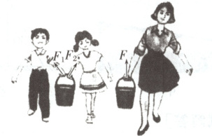 如图所示,一个成年人或两个孩子均能提起同一桶水,那么该成年人用的力与两个孩子用的力的作用效果是否相同?二者能否等效替代?两个孩子共提一桶水时,要想省力,两个孩子拉力间的夹角应大些还是小些?