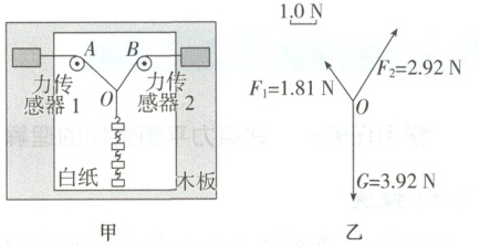 例③ 某学生实验小组设计了一个“验证力的平行四边形定则”的实验,装置如图甲所示,在竖直放置的木板上部附近两侧,固定两个力传感器,同一高度放置两个可以移动的定滑轮,两根细绳跨过定滑轮分别与两力传感器连接,在两细绳连接的结点$O$下方悬挂钩码,力传感器1、2的示数分别为$F_1$、$F_2$,调节两个定滑轮的位置可以改变两细绳间的夹角。实验中使用若干相同的钩码,每个钩码质量均为$100\ g$,取$g = 9.8\ m/s^2$。
