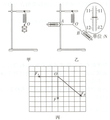 N。(3) 该同学在坐标纸上画出两弹簧测力计拉力$F_A$、$F_B$的大小和方向如图丙所示,请在图丙中作出$F_A$、$F_B$的合力$F'$。