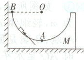 例④ 质量为$M$的凹槽静止在水平地面上,内壁为半圆柱面,截面如图所示,$A$为半圆的最低点,$B$为半圆水平直径的端点。凹槽恰好与竖直墙面接触,内有一质量为$m$的小滑块。用推力$F$推动小滑块由$A$点向$B$点缓慢移动,力$F$的方向始终沿圆弧的切线方向,在此过程中所有摩擦均可忽略,下列说法正确的是 (