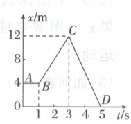 C AB段电动车位移不随时间变化,处于静止状态,选项A错误;BC段发生的位移大小为$12\ m - 4\ m = 8\ m$,CD段发生的位移大小为$12\ m$,所以CD段发生的位移大于BC段发生的位移,选项B错误;从题图可以看出$t = 3\ s$时电动车离出发点最远,为$8\ m$,选项C正确;出发点的坐标为$4\ m$,$t = 5\ s$时电动车的坐标为$0$,距离出发点$4\ m$,选项D错误。