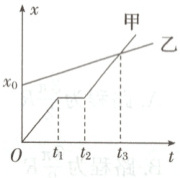 B 由图像知,甲、乙计时起点都是零,同时出发,故A正确;$0 \sim t_2$这段时间内,甲、乙位移不相等,因为它们的初始位置不同,而末位置相同,故B错误;由初始位置坐标可知$x_{甲}=0$,$x_{乙}=x_0$,故C正确;在$t_1 \sim t_2$时间内甲位置坐标没发生变化,故甲停止,乙没有停止,D正确。