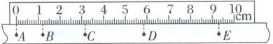(2) 在“练习使用打点计时器”的实验中,某同学选出了一条清晰的纸带,并取其中的 $ A $、$ B $、$ C ·s $ 五个点进行研究,这五个点和刻度尺标度对应的位置如图所示。可求出 $ A $、$ C $ 间的距离为$$