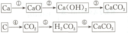 $C\begin{matrix} \xrightarrow{④}\\ \xleftarrow{}\end{matrix} CO_{2}\begin{matrix} \xrightarrow{⑤}\\ \xleftarrow{}\end{matrix}H_{2}CO_{3}\begin{matrix} \xrightarrow{⑥}\\ \xleftarrow{}\end{matrix}CaCO_{3}$