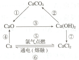 一、$1.①CaCO₃\stackrel{高温}{=}CaO + CO₂↑ ②CO₂ + Ca(OH)₂ = CaCO₃↓ + H₂O ③CaO + H₂O = Ca(OH)₂$