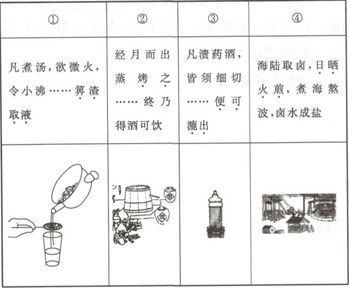 典例1 A ①中的算渣取液,是用细网将固液混合物中的固体和液体分开,其原理与过滤的原理相似;②中通过蒸烤造酒,是通过加热的方法将酒精等物质从混合液中分离出来,其原理与蒸馏的原理相似;③中通过浸泡,使草药中的有效成分溶于酒中,其原理与萃取的原理相似;④中的日晒火煎,卤水成盐,是通过日晒的方法,将水分蒸发得到食盐,其原理与蒸发的原理相似。