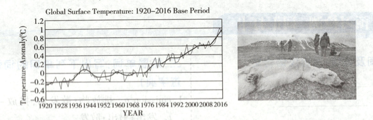 从句2013年,在挪威的北极圈斯瓦尔巴群岛的一个岛上,(人们)发现了一只死亡的北极熊,这张新闻图片令许多人感到震惊。据发现北极熊尸体的科学家说,这只北极熊仅剩“皮包骨”。一位长期研究北极熊的专家说,从尸体的姿势看,这只北极熊像是饿死的。专家称,气候变化导致的海冰面降低意味着北极熊无法像以前那样捕食海豹,于是它只能长途跋涉去寻找食物。这一令人惊恐的案例反映了气温上升对地球生态造成的影响。