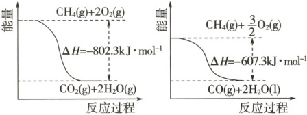 已知:$ {H_{2}O(l) = H_{2}O(g)} $ $ \Delta H = +44.0 \ kJ · mol^{-1} $,甲烷完全燃烧与不完全燃烧的热效应如下图所示。