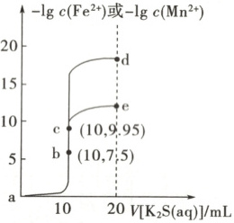 2. A [图中纵坐标为金属离子浓度的负对数,数值越大,离子浓度越小,根据已知$K_{sp}{(MnS)} > K_{sp}{(FeS)}$,即硫离子浓度相等时,$c{(Fe^{2 + })} < c{(Mn^{2 + })}$,可判断$a-c-d$为${FeCl_{2}}$溶液的滴定曲线,$a-b-e$为${MnCl_{2}}$溶液的滴定曲线。由$K_{sp}{(MnS)} > K_{sp}{(FeS)}$可知,${FeS}$比${MnS}$更难溶,所以加入过量${FeS}$不能除去${FeCl_{2}}$溶液中混有的${Mn^{2 + }}$,故A错误;$a-b-e$为${MnCl_{2}}$溶液的滴定曲线,向$10\ mL$浓度为$0.1\ mol· L^{-1}\ {MnCl_{2}}$溶液中滴加$0.1\ mol· L^{-1}\ {K_{2}S}$溶液,b点达到滴定终点,$c{(S^{2 - })} \approx c{(Mn^{2 + })}$,$-\lg\ c{(Mn^{2 + })} = 7.5$,$K_{sp}{(MnS)} = 10^{-15}$,e点时,$c{(S^{2 - })} = \dfrac{1}{3}× 0.1\ mol· L^{-1}$,$c{(Mn^{2 + })} = \dfrac{10^{-15}}{\dfrac{1}{3}× 0.1}\ mol· L^{-1} = 3× 10^{-14}\ mol· L^{-1}$,故e点纵坐标为$-\lg\ c{(Mn^{2 + })} = -\lg\ (3× 10^{-14}) \approx 13.5$,故B正确;$a-c-d$为${FeCl_{2}}$溶液的滴定曲线,d点时,加入$0.1\ mol· L^{-1}\ {K_{2}S}$溶液的体积为$20\ mL$,此时溶液总体积为$30\ mL$,则钾离子的物质的量浓度$c{(K^{ + })} = \dfrac{0.2× 20}{30}\ mol· L^{-1} \approx 0.13\ mol· L^{-1}$,故C正确;a点溶液中${Mn^{2 + }}$和${Fe^{2 + }}$水解,溶液显酸性,分别加入硫化钾生成沉淀,c点${Fe^{2 + }}$恰好完全沉淀,溶质为氯化钾,溶液呈中性,d点硫化钾过量,溶液的主要成分为氯化钾和硫化钾,硫离子水解,溶液显碱性,则溶液的${pH}$:$d > c > a$,故D正确。]