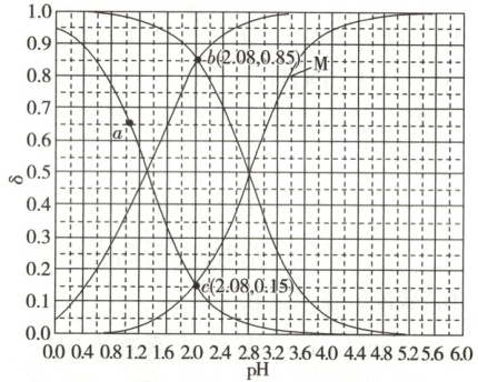 1. D [随着${pH}$的增大,${CH_{2}ClCOOH}$、${CHCl_{2}COOH}$浓度减小,${CH_{2}ClCOO^{-}}$、${CHCl_{2}COO^{-}}$浓度增大,${-Cl}$为吸电子基团,${CHCl_{2}COOH}$的酸性强于${CH_{2}ClCOOH}$,即$K_{a}({CHCl_{2}COOH})>K_{a}({CH_{2}ClCOOH})$,$\delta (酸分子)=\delta (酸根离子)=0.5$时的${pH}$分别约为$1.3$、$2.8$,则两种酸的电离常数分别为$K_{a}({CHCl_{2}COOH})\approx 10^{-1.3}$,$K_{a}({CH_{2}ClCOOH})\approx 10^{-2.8}$,曲线$M$表示$\delta ({CH_{2}ClCOO^{-}})\sim {pH}$的变化关系,A、C错误;根据$K_{a}({CHCl_{2}COOH})=\dfrac {c({CHCl_{2}COO^{-}})× c({H^{+}})}{c({CHCl_{2}COOH})}$,初始c_{0}({CHCl_{2}COOH})=\quantity{0.1}{mol· L^{-1}},若溶液中溶质只有${CHCl_{2}COOH}$,则$c({CHCl_{2}COO^{-}})=c({H^{+}})\approx \sqrt {K_{a}({CHCl_{2}COOH})c_{0}({CHCl_{2}COOH})}=10^{-1.15}{mol· L^{-1}}$,但$a$点对应的c({H^{+}})=\quantity{0.1}{mol· L^{-1}},说明此时溶液中加入了酸性更强的酸,根据电荷守恒,$c({H^{+}}) > c({CHCl_{2}COO^{-}}) + c({OH^{-}})$,B错误;电离度$\alpha =\dfrac {n_{电离}}{n_{始}}$,$n_{始}=n_{电离} + n_{未电离}$,则$\alpha ({CH_{2}ClCOOH})=\delta ({CH_{2}ClCOO^{-}})$,$\alpha ({CHCl_{2}COOH})=\delta ({CHCl_{2}COO^{-}})$,${pH}=2.08$时,$\delta ({CH_{2}ClCOO^{-}})=0.15$、$\delta ({CHCl_{2}COO^{-}})=0.85$,D正确。]