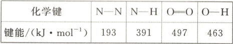 ▐ 活动2 肼($N_2H_4$)是一种良好的火箭推进剂,其与适当的氧化剂(如过氧化氢、氧气等)配合,可组成比冲最高的可贮存液体推进剂。液态肼和液态过氧化氢混合反应时,即产生大量氮气和水蒸气,并放出大量热。若每生成1 mol $N_2$,放出642 kJ的热量,则消耗16 g液态肼放出的热量为多少?若$N_2H_4(g)+O_2(g)\xlongequal\ N_2(g)+2H_2O(g)$ $\Delta H=-544\ kJ· mol^{-1}$,键能数据如下表: