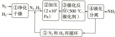 1. 1913年德国化学家哈伯发明了以低成本制造大量氨的方法,从而大大满足了当时日益增长的人口对粮食的需求。哈伯法的流程图如下,其中为提高原料转化率而采取的措施是 (
