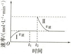 2. B [根据题图中曲线分析$ O \sim t_1 $中$ v_{逆} $逐渐增大至不变时达到平衡,因此在平衡之前$ v_{正} > v_{逆} $,$ t_1 \sim t_2 $时$ v_{正} = v_{逆} $,A错误;根据题图中曲线分析$ t_2 $时刻$ v_{逆} $突然增大,逆向移动,由于容积可变,因此改变的条件是向密闭容器中加入C,B正确;Ⅰ、Ⅱ两过程达到平衡时,$ {A(g) + B(g)⇌ 2C(g)} $反应是等体积反应,因此A的体积分数:Ⅰ = Ⅱ,C错误;Ⅰ、Ⅱ两过程达到平衡时,由于是恒温,因此平衡常数:Ⅰ = Ⅱ,D错误。]