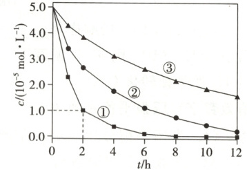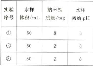 2. C [实验①中,$0\sim 2$小时内平均反应速率$v{(SeO^{2-}_{4})}= \dfrac{(5.0× 10^{-5}-1.0× 10^{-5})\ \mathrm{mol· L^{-1}}}{2\ \mathrm{h}}=2.0× 10^{-5}\ \mathrm{mol· L^{-1}}· \mathrm{h}^{-1}$,A不正确;实验③中水样初始${pH}=8$,溶液显弱碱性,发生反应的离子方程式中不能用${H^{+}}$配电荷守恒,B不正确;综合分析实验①和②可知,在相同时间内,实验①中${SeO^{2-}_{4}}$浓度的变化量大,因此,其他条件相同时,适当增加纳米铁的质量可加快反应速率,C正确;综合分析实验③和②可知,在相同时间内,实验②中${SeO^{2-}_{4}}$浓度的变化量大,因此,其他条件相同时,适当减小初始${pH}$,${SeO^{2-}_{4}}$的去除效果越好,但是当初始${pH}$太小时,${H^{+}}$浓度太大,纳米铁与${H^{+}}$反应速率加快,会导致与${SeO^{2-}_{4}}$反应的纳米铁减少,因此,当初始${pH}$越小时${SeO^{2-}_{4}}$的去除效果不一定越好,D不正确。]