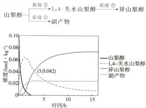 3. A [由图可知,3小时后异山梨醇浓度继续增大,15 h后异山梨醇浓度才不再变化,所以3 h时,反应②未达到平衡状态,即正、逆反应速率不相等,故A错误;图像显示该温度下,15 h后所有物质浓度都不再变化,且此时山梨醇转化完全,即反应充分,而1,4-失水山梨醇仍有剩余,即反应②正向进行程度小于反应①、反应限度小于反应①,所以该温度下的平衡常数:①$>$②,故B正确;由图可知,在$0\sim 3\ \mathrm{h}$内异山梨醇的浓度变化量为$0.042\ \mathrm{mol· kg^{-1}}$,所以平均速率$v(异山梨醇)=\dfrac{0.042\ \mathrm{mol· kg^{-1}}}{3\ \mathrm{h}}=0.014\ \mathrm{mol· kg^{-1}· h^{-1}}$,故C正确;催化剂只能改变化学反应速率,不能改变物质平衡转化率,所以反应②加入催化剂不改变其平衡转化率,故D正确。]