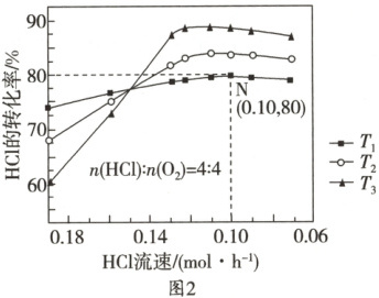(4)图中在较高流速下,$T_{3}$温度下${HCl}$的转化率小于温度较高的$T_{1}$和$T_{2}$,主要原因是流速过快,反应物分子来不及在催化剂表面接触发生反应,导致转化率减小,同时,$T_{3}$温度低,反应速率小,故单位时间内氯化氢的转化率小。