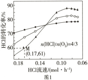 (3)A.由图像可知,增大${HCl}$的流速,${HCl}$的转化率在减小,不符合题意;B. M点对应温度为$360\ ^{\circ}C$,由图像可知,升高温度,${HCl}$的转化率增大,符合题意;C.增大$n{(HCl)}:n{(O_{2})}$,${HCl}$的转化率减小,不符合题意;D.使用高效催化剂,可以增大该温度下的反应速率,使单位时间内${HCl}$的转化率增大,符合题意。