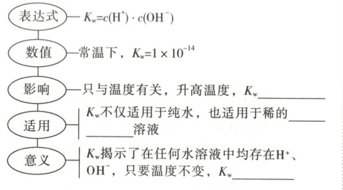 (1)水的离子积常数$K_\mathrm{w}=c(\mathrm{H^+})· c(\mathrm{OH^-})$,不仅适用于纯水,也适用于一切酸、碱、盐的稀溶液。在任何酸、碱、盐的稀溶液中,只要温度一定,$K_\mathrm{w}$就一定。