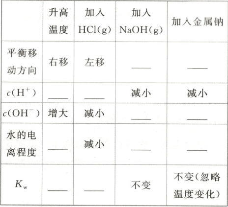 ②外加酸(或碱),水中$c(\mathrm{H^+})[或c(\mathrm{OH^-})]$增大,会抑制水的电离,水的电离程度减小,$K_\mathrm{w}$不变。