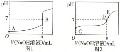2.C [盐酸与醋酸的浓度均为$0.100\ 0\ mol·L^{-1}$,图1溶液起始${pH}=1$,表示盐酸的滴定曲线,图2溶液起始${pH}=3$,表示醋酸的滴定曲线。$0.100\ 0\ mol·L^{-1}$醋酸的${pH}=3$,即$c{(H^{+})}=1.0×10^{-3}\ mol·L^{-1}$,${CH_{3}COOH}$的电离度为$\frac{1.0×10^{-3}\ mol·L^{-1}}{0.100\ 0\ mol·L^{-1}}×100\%=1\%$,故A错误;图1表示盐酸的滴定曲线,故B错误;达到B状态时,$a=20.00$,若$b=20.00$,则恰好完全反应生成醋酸钠,溶液显碱性,而D状态溶液显中性,因此达到D状态时,$b<20.00$,故C正确;滴定${CH_{3}COOH}$溶液达到滴定终点时溶液呈碱性,不能用甲基橙作为指示剂,故D错误。]