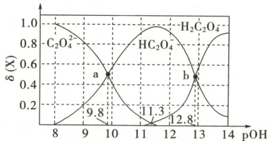 1. B [反应$H_2C_2O_4+C_2O_4^{2-}\rightleftharpoons2HC_2O_4^-$的平衡常数$K=\frac{c^2(HC_2O_4^-)}{c(C_2O_4^{2-})· c(H_2C_2O_4)}=\frac{c(HC_2O_4^-)}{c(C_2O_4^{2-})· c(H^+)}·\frac{c(HC_2O_4^-)· c(H^+)}{c(H_2C_2O_4)}=\frac{K_{a1}}{K_{a2}}$,a点$c(C_2O_4^{2-})=c(HC_2O_4^-)$,此时$pOH=9.8$,则$c(OH^-)=10^{-9.8}\ mol·L^{-1}$,$c(H^+)=10^{-4.2}\ mol·L^{-1}$,则$K_{a2}=\frac{c(C_2O_4^{2-})· c(H^+)}{c(HC_2O_4^-)}=10^{-4.2}$;同理b点$c(HC_2O_4^-)=c(H_2C_2O_4)$,可得$K_{a1}=10^{-1.2}$,所以该反应的平衡常数$K=\frac{10^{-1.2}}{10^{-4.2}}=10^3$,A正确;温度升高,水的电离程度增大,水的离子积变大,pH和pOH之和小于14,则曲线将整体向左移动,B错误;$\frac{c(C_2O_4^{2-})}{c(H_2C_2O_4)}=\frac{c(C_2O_4^{2-})· c(H^+)}{c(HC_2O_4^-)}·\frac{c(HC_2O_4^-)· c(H^+)}{c(H_2C_2O_4)}·\frac{1}{c^2(H^+)}=\frac{K_{a1}· K_{a2}}{c^2(H^+)}=\frac{10^{-4.2}×10^{-1.2}}{(10^{-7})^2}=10^{9.6}$,C正确;$H_2C_2O_4$的$K_{a1}=10^{-1.2}$,$K_{a2}=10^{-4.2}$,则$C_2O_4^{2-}$的水解平衡常数$K_h=\frac{K_w}{K_{a2}}=\frac{10^{-14}}{10^{-4.2}}=10^{-9.8}$,即$HC_2O_4^-$的电离程度大于$C_2O_4^{2-}$的水解程度,溶液呈酸性,$Na^+$不水解,所以混合溶液中离子浓度大小关系为$c(Na^+)>c(C_2O_4^{2-})>c(HC_2O_4^-)>c(H^+)>c(OH^-)$,D正确。]