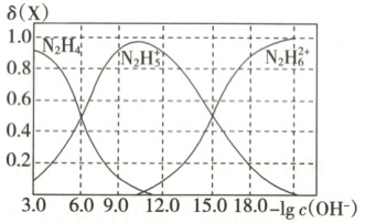 2. 已知联氨($N_2H_4$)为二元弱碱,常温下将盐酸滴加到联氨($N_2H_4$)的水溶液中,混合溶液中微粒的物质的量分数$\delta(X)$随$-\lg c(OH^-)$变化的关系如图所示。下列叙述错误的是 (