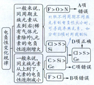 比较不同周期不同族元素的电负性大小时,可寻找参照性元素,如分析D项时所选的Si