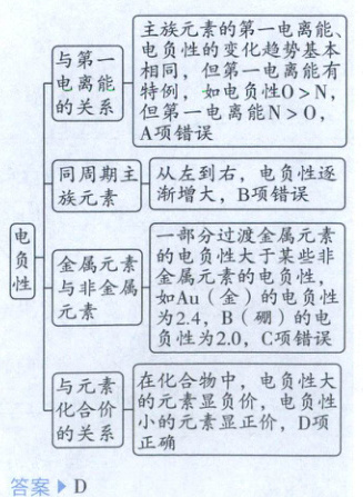 一部分过渡金属元素的电负性大于某些非金属元素的电负性,如Au(金)的电负性为2.4,B(硼)的电负性为2.0,C项错误