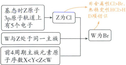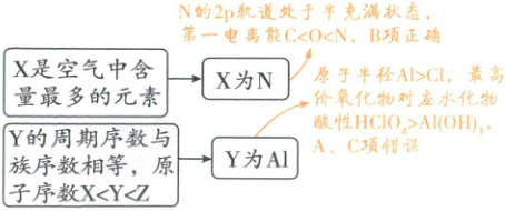 例18 (江苏卷)前4周期主族元素X、Y、Z、W的原子序数依次增大,X是空气中含量最多的元素,Y的周期序数与族序数相等,基态时Z原子3p原子轨道上有5个电子,W与Z处于同一主族。下列说法正确的是