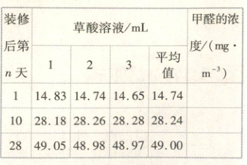 (4)数据处理:分别于装修完工后的第1天、第10天、第28天(室内始终保持通风换气)对室内空气进行取样,通过实验测得以下三组数据(每次实验所取的$KMnO_{4}$溶液均为20.00mL):