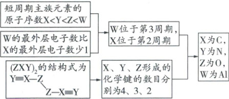 例2 (辽宁名校联盟月考)短周期主族元素$\mathrm{X}$、$\mathrm{Y}$、$\mathrm{Z}$、$\mathrm{W}$的原子序数依次增大,$\mathrm{W}$的最外层电子数比$\mathrm{X}$的最外层电子数少1,$\mathrm{X}$、$\mathrm{Y}$、$\mathrm{Z}$为同一周期元素,$\mathrm{X}$、$\mathrm{Y}$、$\mathrm{Z}$组成的一种化合物$(\mathrm{ZXY})_2$的结构式为$\mathrm{Y≡X—Z}$、$\mathrm{Z—X≡Y}$,下列说法正确的是