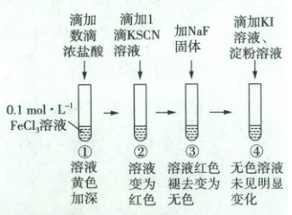 已知:${[FeCl4]-}$为黄色、${[Fe(SCN)]^2+}$为红色、${[FeF6]^3-}$为无色。