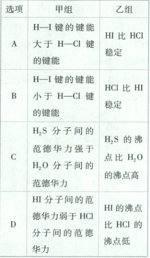 解析 碘和氯属于同主族元素,碘的原子半径大于氯的原子半径,H—Cl键的键能大于H—I键的键能,故HCl比HI稳定,A项错误,B项正确。H₂S、H₂O的结构和组成相似,但由于H₂O分子间存在氢键,所以H₂O的沸点高,C项错误。HCl、HI的结构和组成相似,HI的相对分子质量更大,HI分子间的范德华力强于HCl分子间的范德华力,故HI的沸点要高于HCl的沸点,D项错误。