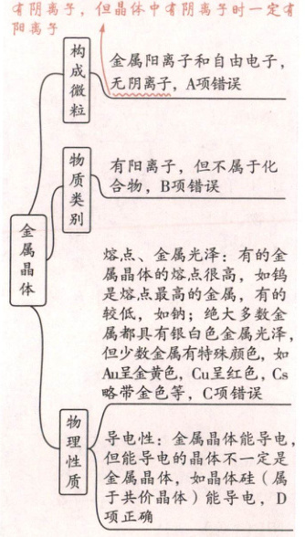 【易错】含有阳离子的晶体中不一定含有阴离子,但晶体中有阴离子时一定有阳离子,A 项错误