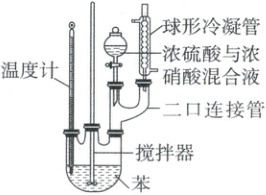 例18 实验室制备硝基苯的反应装置如图所示(在$50\sim 60\ {° C}$下发生反应,加热装置已略去)。下列有关说法错误的是