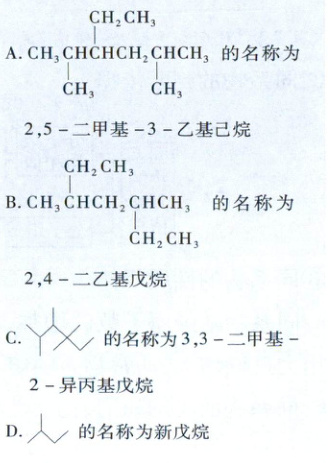 【解析】:A项,选最长碳链为主链,该有机物主链含6个碳(己烷),支链最多(3个取代基);编号从离支链最近端开始,取代基位次为2、3、5,分别为2-甲基、5-甲基、3-乙基,名称为2,5-二甲基-3-乙基己烷,正确。B项,主链未选最长,含乙基的碳链应为主链(7个碳,庚烷),正确名称为3,5-二甲基庚烷,错误。C项,2号碳上连异丙基导致主链非最长,正确名称为2,3,4,4-四甲基己烷,错误。D项,结构应为异戊烷(2-甲基丁烷),新戊烷为2,2-二甲基丙烷,错误。
