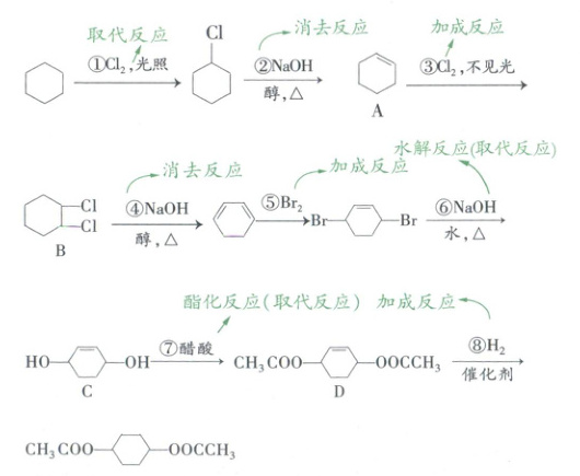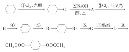 例 21 由环己烷可制备 1,4 - 环己二醇的二醋酸酯,有关的 8 步反应(其中所有无机产物都已略去)如图所示: