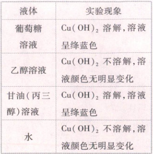 例3-14 某化学活动小组在探究葡萄糖分子的组成和结构时,设计并完成了一组实验:分别取 2 mL 表中四种液体加入 2 mL 新制 ${Cu(OH)_{2}}$ 悬浊液中,充分振荡。实验现象记录如表所示: