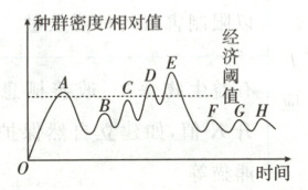 C.图中字母代表的时间点,必须进行害虫防治的时间为 A、D、E