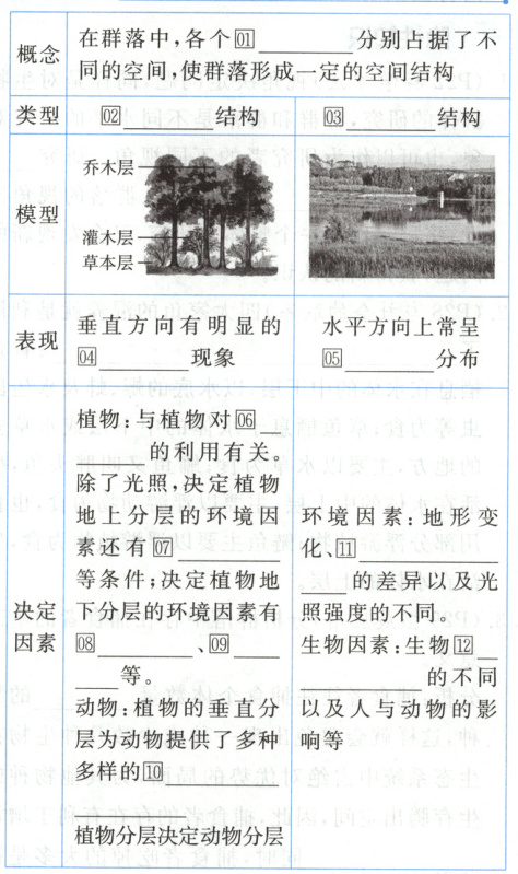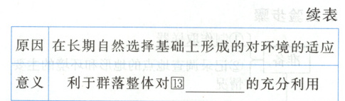 知识点三 ①生物种群 ②垂直 ③水平 ④分层 ⑤镶嵌 ⑥光 ⑦温度 ⑧水分 ⑨无机盐 ⑩栖息空间和食物条件 ⑪土壤湿度和盐碱度 ⑫自身生长特点 ⑬自然资源