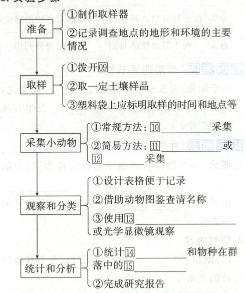 知识点六 ①微小 ②较强 ③取样器取样 ④物种数和物种在群落中的相对数量 ⑤记名计算法 ⑥目测估计法 ⑦个体较大 ⑧种群数量有限 ⑨表层土上的落叶 ⑩诱虫器 ⑪包纱布的镊子 ⑫吸虫器 ⑬放大镜、体视显微镜 ⑭物种丰富度 ⑮相对数量 ⑯物种丰富度 ⑰越多 ⑱越复杂 ⑲电灯 ⑳趋暗、趋湿、避高温 ㉑将土壤小动物吸走 ㉒70%的酒精 ㉓吸虫器