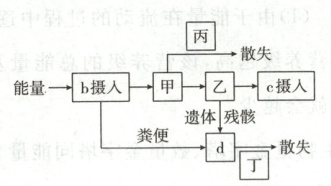 [例 1] 某生态系统中有 a、b、c、d 四种生物,构成食物链“a→b→c”,d 为分解者。该生态系统中能量流经 b 的过程如图所示,其中甲、乙表示能量,丙、丁表示过程。下列相关说法错误的是(