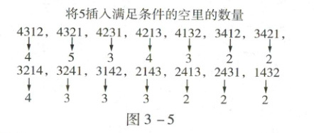 解析▶先考虑$1, 2, 3, 4$四个数字满足条件的排列为$14$个,然后考虑数字$5$插入每种类型的情形,如图3-5,满足条件的排列数共$42$种.