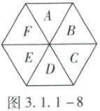 例 10 [教材改编 P25 T3] 如图 3.1.1 - 8,一个正六边形分为$6$个区域$A$,$B$,$C$,$D$,$E$,$F$,现给这$6$个区域着色,要求同一区域着同一种颜色,相邻的两个区域不得使用同一颜色,现有红、黄、蓝、绿四种颜色可供选择,且$A$必须涂红色,有