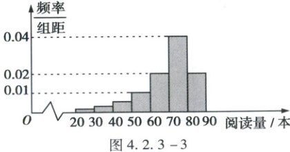 例13 为了解大学生课外阅读情况,现从某高校随机抽取100名学生,将他们一年课外阅读量(单位:本)的数据分成7组,即$[20,30),[30,40),·s,[80,90]$,并整理得到样本的频率分布直方图,如图4.2.3-3所示。