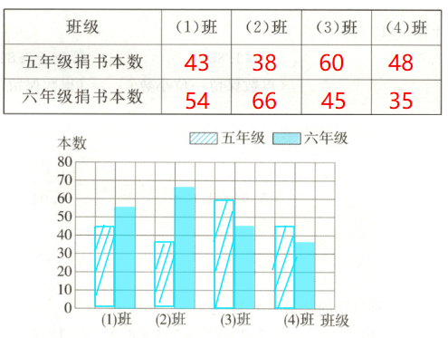 实验小学五、六年级各个班同学向贫困山区儿童捐书情况如下:五(1)班43本,五(2)班38本,五(3)班60本,五(4)班48本;六(1)班54本,六(2)班66本,六(3)班45本,六(4)班35本。