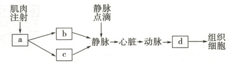 6. 下图表示药物经注射(肌肉注射或静脉注射)到达要治疗的细胞过程,图中所示a、b、c、d的名称分别是 (