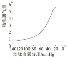 7. 缺氧是指组织氧供应减少或不能充分利用氧,导致组织代谢、功能和形态结构异常变化的病理过程。动脉血氧分压与肺泡通气量(基本通气量为 1)之间的关系如图。下列有关叙述错误的是 (